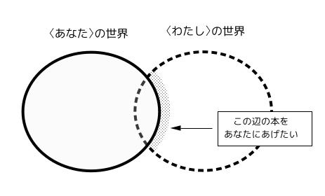 そこで贈本屋である、というのはすこし都合が良過ぎるだろう。上図のように、〈わたし〉は〈あなた〉の世界の外側を知っているかもしれないが、逆に〈あなた〉の世界を正確に知っているわけではないので、結局「ちょうどいい本」は分からない。それでも〈あなた〉自身で選ぶより、ちょうどいい本に遭遇する可能性は高そうに思える。