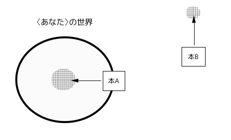 形を変形して、このような図にすれば、〈わたし〉が〈あなた〉のためにちょうどいい選択ができる気になる。実線の〈あなた〉の世界と点線の〈わたし〉の世界の共通部分に「本A」がある。〈あなた〉も〈わたし〉も共通する経験があり、共通する感性を持っているだろうからだ。万人向けで、軽く読めて、すぐ消費できる本は「本A」となる。そして〈わたし〉の得意(特異)なところの本が〈あなた〉にとっての「本B」になる。「本B」は誰でも読めるわけでなく、それを読むための相応の労力を要する本といえるだろう。〈わたし〉はその本に必要な労力を把握しているはずで、〈あなた〉との対話からちょうど良さそうな本を選べるかもしれない。