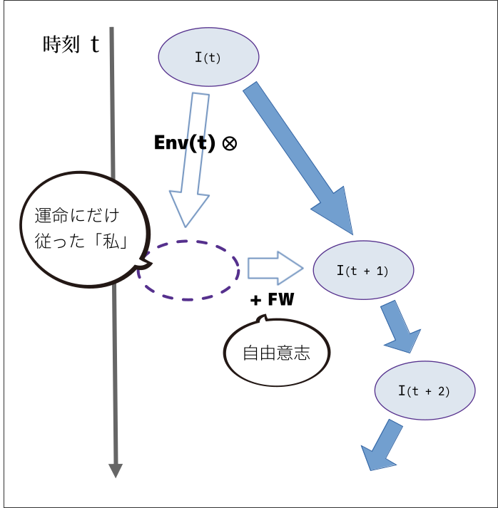 時刻が上から下へ流れていくときの「私」の軌跡(塗りつぶされた青い矢印)を図示すれば、運命と自由意志は下記のような関係になる。