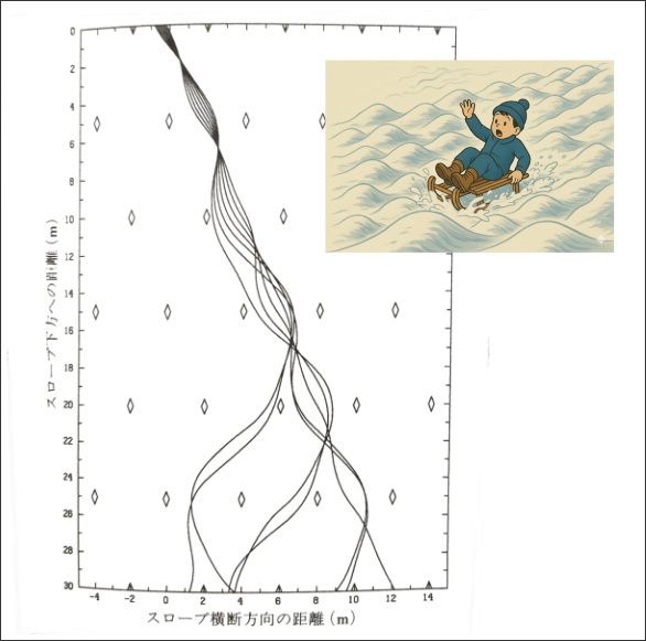 このシミュレーションでは、ソリに乗る人は軌跡を自らコントロールすることはなく、ただ凹凸に従って軌跡が変化する。複数の線は初期条件のわずかな違いを示しており、最初の位置が少しずれるだけで、全く異なる軌跡になることが分かる。図の上部では規則的で似たような軌跡で始まっているが、下に行くほど軌跡の違いは顕著になり、最下端に到達するころには全くバラバラの動きをしている。