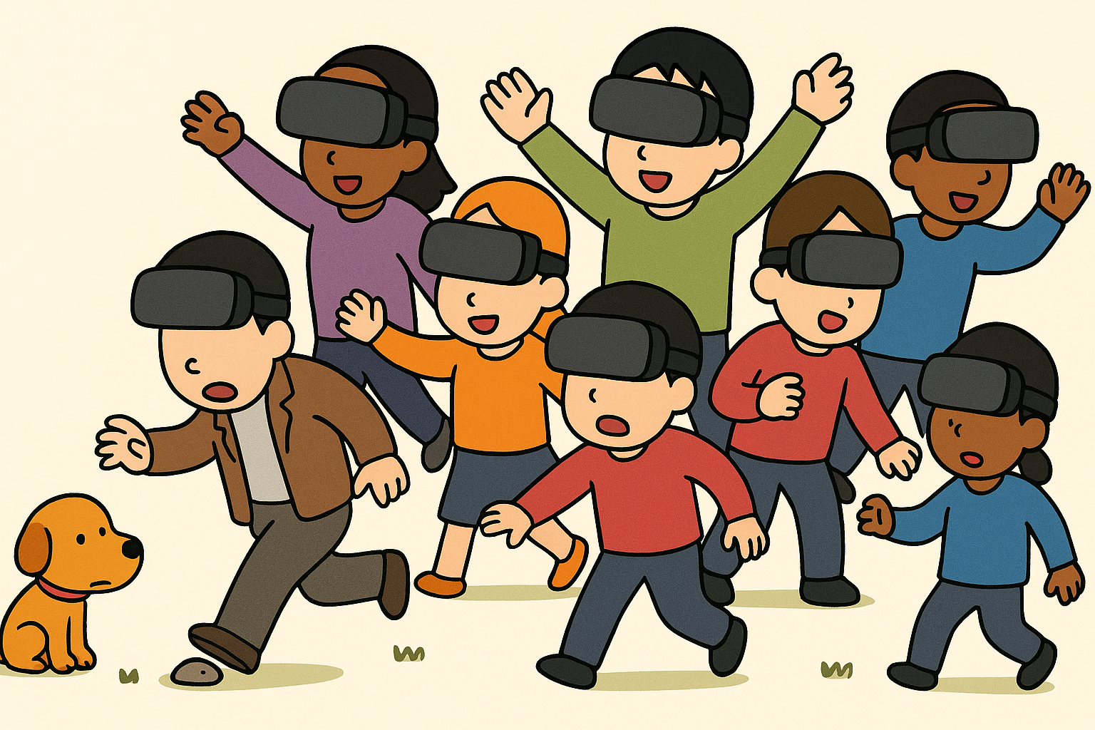 現代人を揶揄的に描けば、こんなイメージになる。人間の進化によって獲得した「意識」は、人間が作った「秩序」に従属するための虚構を見せている。VRゴーグルで彼らにとって都合いい共同幻想を見ているようなものだ。左下の人は石に躓きそうだが気づいていない。ゴーグルをしていない犬にしてみれば、石がそこにあって躓いたのだから、転んで当然に見える。しかし、躓いた本人には原因が分からず、不条理であるとしか思うことができない。VRゴーグルを外せば原因は簡単に分かることであっても、VRゴーグルの中の都合の良い「現実」と辻褄を合わせるための都合の良い根拠をでっち上げることに脳みそのエネルギーを使ってしまう。