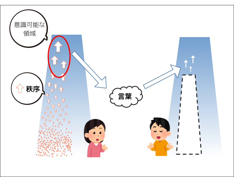 言葉は意識できる概念の表現であり、その背後は主に高次の秩序があると考えられる。そうだとすると「言葉を伝えること」は、意識の上の高次の秩序を相手の意識へと移そうとする行為と言える。自ら獲得した概念は、低次の階層から順に秩序立って作られたものであり、そのような概念を言葉として表現して誰かに伝えた時、受け取った側は自身の中にある秩序でその言葉を解釈しようとする。言葉は言葉にした途端に低次の秩序がこぼれ落ちるので、相手がそれを補うことができなければ、その言葉は実感を伴わないものになる。言葉ばかりで作られて下支えする秩序が希薄な意識は、現実をそのまま捉えられず、自ら作り上げた虚像を現実だと思いこんでしまうし、外界のカオスを受け入れるができなくなり、不自由になる。